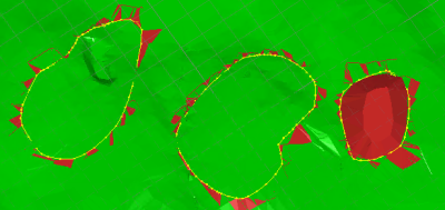 Displaying only the generated cut and fill volumes and swapping to a plan view reveals unwanted artefacts. With clipping turned off, the distinct cut and fill volumes are identifiable as green and red respectively, but you can see the unwanted fragments that surround each volume, showing a mixture of red (fill) and green (cut) "noise". There are also a pair of outlier data fragments at the original topography object boundary.