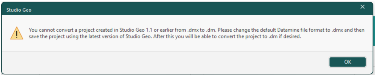 Opening a project in .dm mode automatically downgrades any .dmx files in the project folder or subfolders to .dm mode. If the project you are opening was created in Studio Geo 1.1 or earlier, this action is blocked (because vital metadata is lost) and a warning displays:
