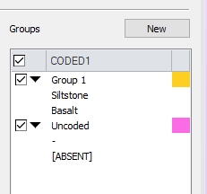 Auto Apply – If checked, any changes made to the grouping of lithologies, including the creation of new grouping fields and group values/assignments, will be instantly reflected in the loaded drillhole data object (but not the physical file).