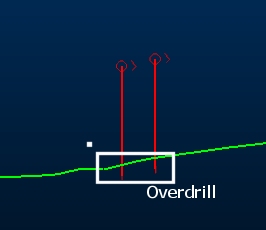 One exception to this is when defining holes using both collar and target position. In this case, the resultant hole length will that sufficient to travel between the collar and the target, plus the required overdrill distance. The effects of overdrill are particularly obvious when defining target position, for example by snapping to a wireframe surface. In these case, the hole will not terminate at the surface, but will continue the specified overdrill distance past it, for example: