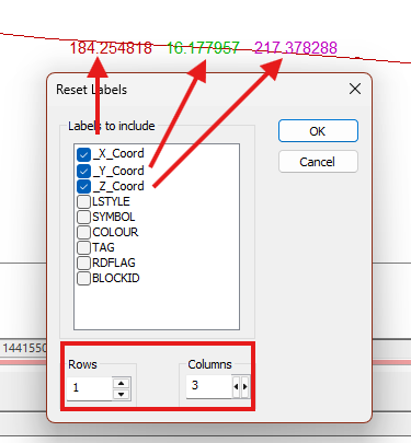 Choose how many Rows and Columns comprise the table used to display labels. Consider the following examples, where coordinate fields are laid out horizontally and vertically (the colouring was applied using the Style tab after the Reset).