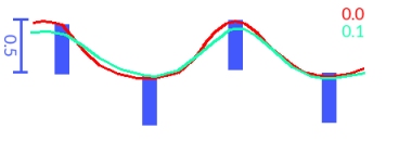 For example, in the image below, a surface is constructed initially with zero uncertainty (red) to model a categorical value (in this case, lithology). The next run, a value of 0.1 is used which allows the resulting surface to pass close to, but not necessarily through, the FROM of each sample interval (green).