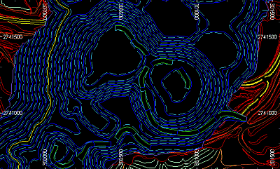 The important point to note about the central image is that, despite the presence of green pit road strings rising out of the pit base in the original image, these strings are not closed, and as such, it is either the surrounding blue bench strings that are used to colour these features or the cyan colour representing the lower pit contours - this is because these are the closest closed strings the encapsulate the wireframe triangle centroids of the pit road. Similarly, the extensive green area surrounding the pit contours doesn't tally with the first image; this is expected as the red / turquoise / orange contours do not represent fully closed strings. Although not shown in the image, the entire surrounding topography is enclosed by a green contour line, and it is the green attribute that is used to colour this DTM region.