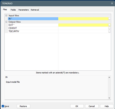 Processes are recognizable by the typical "Files, Fields and Parameters" tabbed screen, for example, the TONGRAD process looks like this: