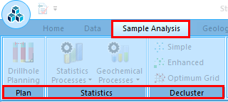 6. Select New Group and Rename your command group - this description will appear below the icons in the new command group. In the example, below, the Sample Analysis ribbon (tab) contains 3 groups; Plan, Statistics and Decluster:
