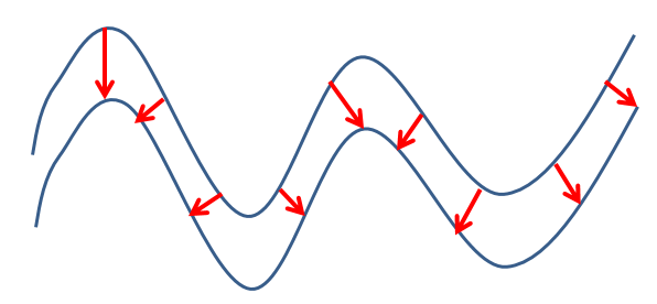 Thickness is the distance inside a wireframe from one side to the other. In some cases this may be measured within a closed wireframe, but in others multiple DTMs may represent the interfaces between different volumes. Note that sense of what is inside a wireframe is determined by the direction of the triangle the point is on. For properly verified objects, this should always underneath true DTMs, and inside of fully closed wireframes.