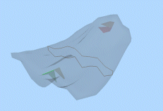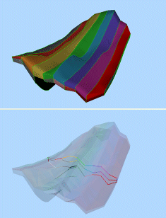 An example of the use of feature edges can be seen using the pit profile form the tutorial data (C:Database\DMTutorials\VBOP\Data\Datamine\_vb_trpit240tr/pt). Choosing a feature edge of 45 degrees creates strings representing the toe and crest of each bench, and the edges of the haul road. Note how the bench limits are generated as strings as the data normals in this areas supersede the 45 degree limit: