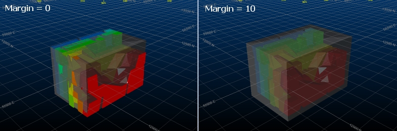 - The MSO shape framework extents can be identical, but are specified independently - the Framework Extents are represented by a cuboid within which your stope shapes will be generated. Normally, the shape framework will extend beyond the extents of the model in each direction, fully encapsulating it. You can easily check this is the case using the Extents Visualization controls at the bottom of the panel.