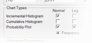 The drop-down lists the available charts, as selected in the Chart Types group on the Data Selection tab. In the example shown below, the selection results in three items being listed in the drop-down list i.e. [Histogram], [Probability Plot] and [Log Probability Plot].