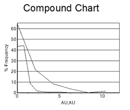 A single chart can contain one or more histograms as illustrated in the graphic below which shows AU histograms for two different rock types. A compound chart is displayed by selecting the Compound Chart option in the Charts Layout area on the Data Selection tab of the Histogram dialog.