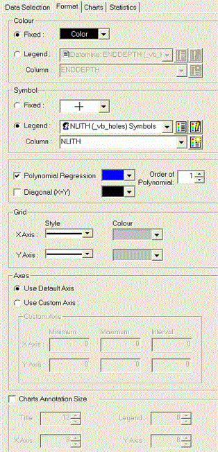 This Format tab is used to manage the global scatter plot color, symbol, grid, axes and annotation settings; fit a regression line.