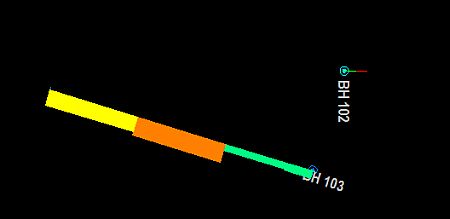 The various data column styles applied to the drillholes are always visible, no matter what the orientation of the drillhole. In the example below, the upper drillhole is orientated vertically and so the bar graph is displayed 'on edge':