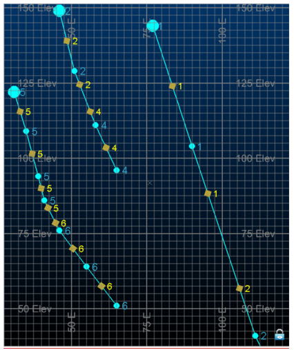 The graphic below illustrates the assignment of attribute fields. Three strings from a SECTSTR file are coloured cyan. Each point in each string is annotated with numeric attribute value A1. Attribute values coloured brown are written to the POINTS file.