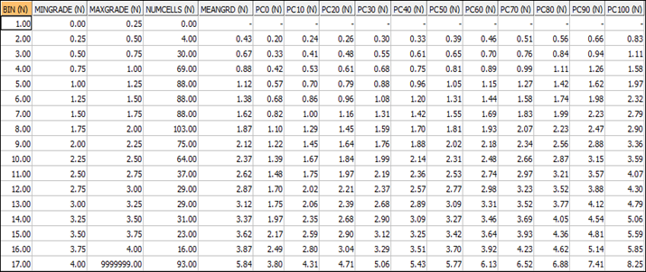 The PCxx columns show the average percentile values for the cells - for example, the following probability values are shown for BIN 13 (3.0 - 3.25 g/t):