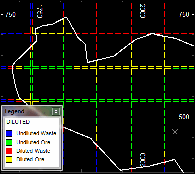In the table above the *ROCK field ORE has a value 1 for ore and 0 for waste and the density of undiluted ore is 2 and waste is 1. The column DILUTED identifies undiluted material (0) and diluted material (1). A DILUTED value of absent (-) shows the combined undiluted plus diluted material.