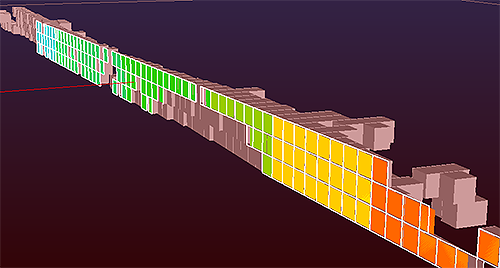 The metal content and mass from the stope wireframe data is the same in the block model for the cells representing the MSO shapes, although an optional comparison table is available for analysis. All cells outside the MSO volumes are not considered ore. This process is intended to apply the selective mining units generated by MSO (or by any other means) into the model to be used for optimizing in Studio NPVS.