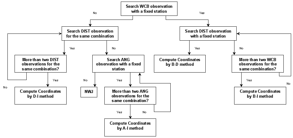 The provisional coordinate computation stage mentioned in Figure 1 refers to a network of hierarchical procedures to compute the coordinates when parameter @CALCTYPE is set to 0 (automatic mode). The preference in the network is given to coordinate computations methods in which a lower error level can be normally assumed. Therefore, bearing and distance method is preferred over bearing intersection, which in turn is preferred over distance intersection and so on. A summary of the hierarchical network is shown in Figure 2.
