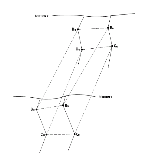 Figure 5 shows the median line AM BM CM DM EM FM for section k. The length of this line is denoted BLEN . The average length of the down-dip axis is then calculated as the weighted average of the k BLEN values over all sections. The weights used are the distance of influence of each section ie k half way to the next section measured along the C axis.