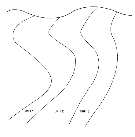 In the majority of cases the sections on which the structures have been defined will be parallel. If this is not the case then it is assumed that the sections are perpendicular to the strike, as illustrated in the plan view in Figure 6, below - that is, all points on any given section have the same `along strike' (UCSC) coordinate.