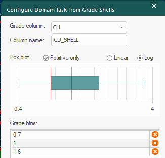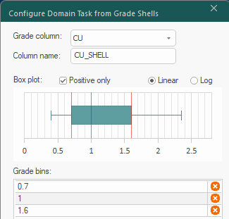 The Configure Domain Task from Grade Shells screen is used to define the grade bins to be represented as distinct models in the output combined solids data from the Dynamic Modelling workflow.