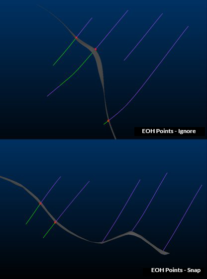 Choose how end-of-hole positions are treated using EOH points controls. These are similar to the collar points, with the final option to force surface generation to occur either on or below the EOH point(s). For example: