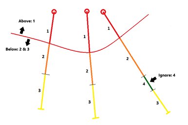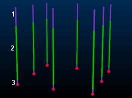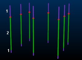 For example, the following holes contain 2 numerical lithological values, 1 (purple) and 2 (green). In this case, there are two instances of 1 per hole, resulting in an ambiguity as to where the surface contact points lie.