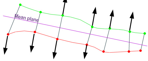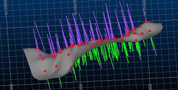 For example, the data below shows drillholes in section with the mean plane shown in purple, and the direction of the corresponding normals for the output surface: -