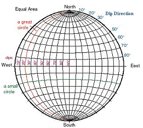 The ‘grid lines’ on a stereonet plot show the projection of a set of great circles and a set of small circles that are perpendicular to one another (just like longitude and latitude lines, respectively, on the globe). These ‘grid lines’ can be used to locate the orientation of planes (and lines). The image below shows an equal area stereonet with the positions of the Dip Direction and Dip 'grid lines'.