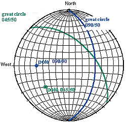 The diagram below shows two planes, each represented by both ‘great circles’ and ‘poles’. The green plane has an orientation of 045/50 (dip direction/dip) and the blue plane an orientation of 090/50: