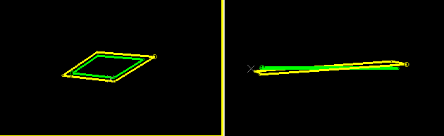 Consider the following example, where a simple square closed string (with all data at the same elevation) is expanded by 5m. Where the initial view directional is orthogonal to a horizontal or plan section, and this is the section upon which the string is digitized, expansion is performed outwards but remaining on the horizontal plane (image shows the original top-down view and side view after expansion):