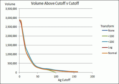 grade, and volume above cutoff for different transformations, and