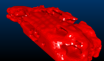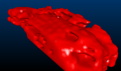 When using larger triangle sizes, noticeable ramping steps may be visible in the output wireframe. These can be smoothed during generation by selecting the Smooth Isosurfaces option. This process ‘averages out’ regional differences between existing vertices, rather than adding additional vertices to the wireframe. Smoothing can also be performed on the wireframe after generation by using the wireframe-smooth command. Excessive smoothing should be avoided, however, as this can reduce volumes.