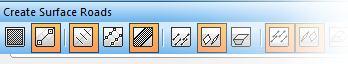 Along the top of the Create Surface Roads task panel there is a command toolbar containing access to road generation and topography update commands. These are convenient alternatives to the in-panel buttons below and typically represent a left-right workflow, although you can use them to generate interim data at any point.