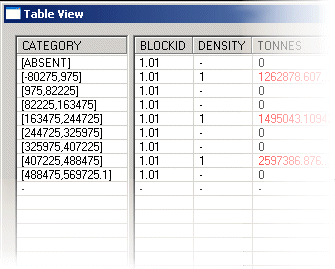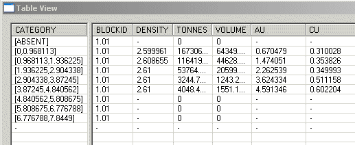 The read-only Table View dialog quickly analyses all currently selected string data, and makes the necessary projection(s) to define the relevant evaluation volume(s). Once this has been calculated, the cells falling within the evaluation zone are analysed in relation to all of the important fields selected in the Dynamic Evaluation Settings screen. Results for TONNES and VOLUME will always be displayed alongside the relevant BLOCKID. If additional fields were selected for evaluation, such as PHASE, SEQUENCE, VALUE, average AU grade and so on, these are also shown for each table record: