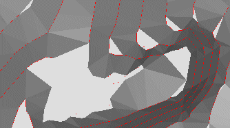 The effect of this setting can be hard to visualize, but is best described by means of an example. The following image shows a magnified section of a topographical contour string file. The area highlighted in grey represents the area where most 'decision making' must be made by any surfacing routine, due to the multitude of options for connecting separated vertices: