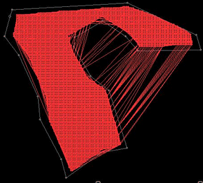 The important point to note about the central image is that, despite the presence of green pit road strings rising out of the pit base in the original image, these strings are not closed, and as such, it is either the surrounding blue bench strings that are used to colour these features or the cyan colour representing the lower pit contours - this is because these are the closest closed strings the encapsulate the wireframe triangle centroids of the pit road. Similarly, the extensive green area surrounding the pit contours doesn't tally with the first image; this is expected as the red / turquoise / orange contours do not represent fully closed strings. Although not shown in the image, the entire surrounding topography is enclosed by a green contour line, and it is the green attribute that is used to colour this DTM region.