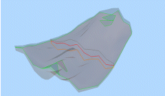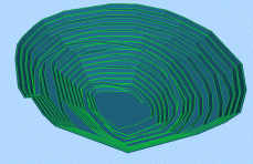 An example of the use of feature edges can be seen using the pit profile form the tutorial data (C:Database\DMTutorials\VBOP\Data\Datamine\_vb_trpit240tr/pt). Choosing a feature edge of 45 degrees creates strings representing the toe and crest of each bench, and the edges of the haul road. Note how the bench limits are generated as strings as the data normals in this areas supersede the 45 degree limit:
