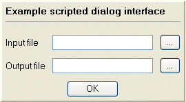 Consider the following example, which displays two file browser windows to define an input and output file. The selected file names are stored in the parent screen's tbInput and tbOutput list controls. This example doesn't do anything else, but it could easily be extended to perform a function on the input file (a design command or process), saving the output accordingly.