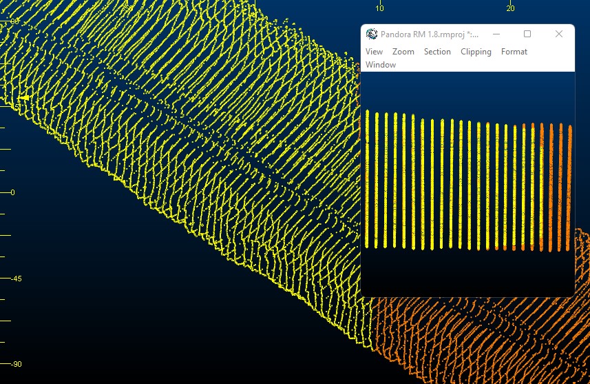 This example relates to data captured from a fixed CMS, resulting in fan of survey points originating from strings of a common origin, captured at regular dip changes. For example:
