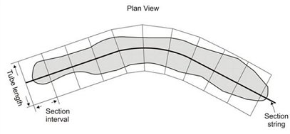 Complex Stope Shape: in operational mine designs the sections may not be parallel e.g. radial sections, and the gradient may vary across strike as well as along strike for wide orebodies. To accommodate these requirements a more flexible geometry is achieved by using strings, known as "Polytube strings" to define the tube corner lines. Annealing overheads are increased for this flexibility.