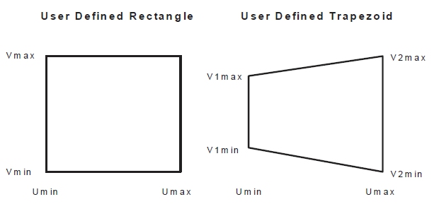 Stope Rectangles and Stope Trapezoids: for rectangular definitions (Stope Rectangles option), you can define your own U and V minimum and maximum values. The Stope Trapezoids option allows you to determine the additional point settings required to define the non-orthogonal shape. A trapezoid stope-shape has two opposite parallel sides and is defined by the coordinates (umin, umax, v1min, v1max, v2min, v2max). The Position field is reserved for future use.
