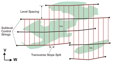 The stope sections (U-axis) may be regularly spaced or irregularly spaced. At the same time, the stope levels (V-axis) may be regularly spaced, irregularly spaced or irregularly spaced with variable Gradient.