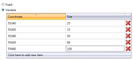 Variable: similar to the definition of variable U-axis sections, use the table to define a 'map' of intervals and sizes to define a variable framework. For example, like having 4 x 25m levels and 1 x 15m sill pillar level for a mine block covering 115m vertical extent which is repeated, or like having 15m primary and 20m secondary stopes along strike (for vertical orientations).
