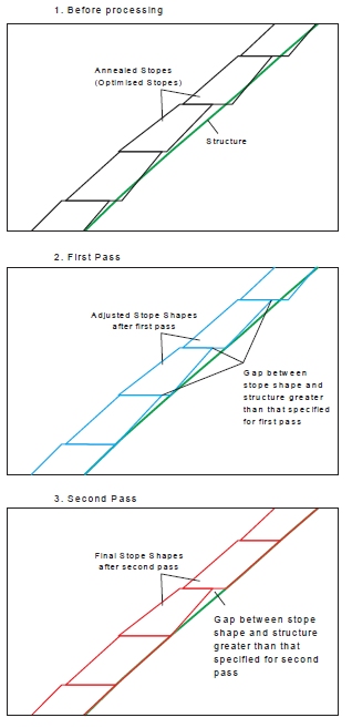 MSO assesses both options in generating the seed-shape, and applies the same rules to the annealed shape. If the snapping-to shape is sub-economic, then MSO will still consider the “standing-off” option. This will depend upon the relative position of mineralized material and the structure surface.