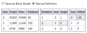 Framework extents: this table provides a summary of the parameters used to define the cuboid within which stope shapes will be generated. Also referred to as a 'Shape Framework', you can either choose to copy the model extents (meaning an exact fit with the model boundary, resulting in a read-only table of values, or you can select the Manual Definition option which will allow you to edit the existing values.