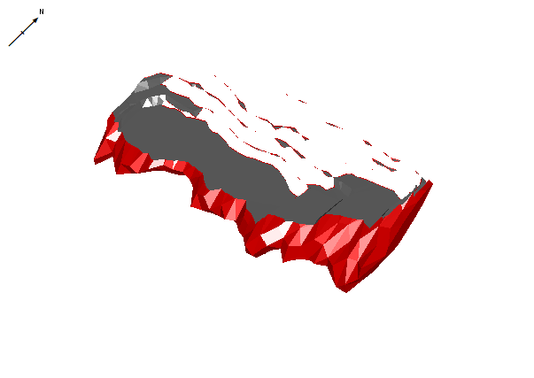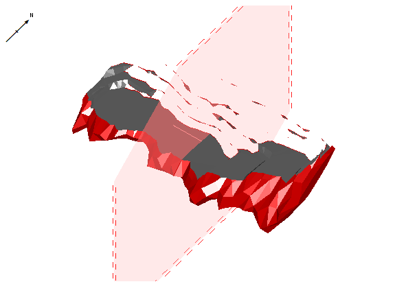 For example, in the image below, a wireframe orebody is viewed in the direction indicated by the red arrow: