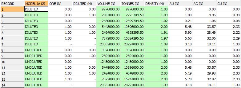 Records 7 and 14 show the tonnes and grades for the total diluted and undiluted models respectively. These two sets of figures are identical because when averaged over ore and waste there is no change in the grade.