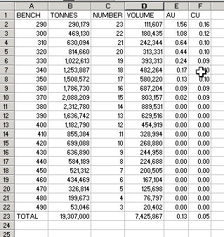 The results are automatically broken down by bench, taken from the block model cell height. An overall total evaluation is also determined and optionally the results can be reported by KEY field. The BENCH number reported refers to the 'base' of each bench.