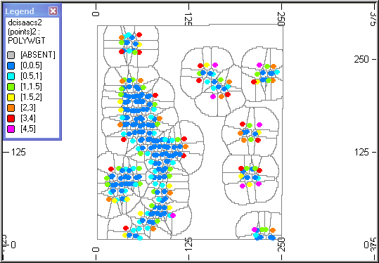 If the samples are regularly spaced then every sample will have a weight of 1. Clustered samples will have weights less than 1, and isolated samples weights greater than 1. Both the unweighted and weighted means of the DCFIELD values are reported in the Command window.