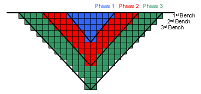 The difference between each pit shell and the next is considered to be a “phase”.  Considering that realizing the best value first is a basic principle of maximizing NPV the order of the phases represents the first high level categorization of the value and the first stage of determining the Optimal Extraction Sequence for the ultimate pit.